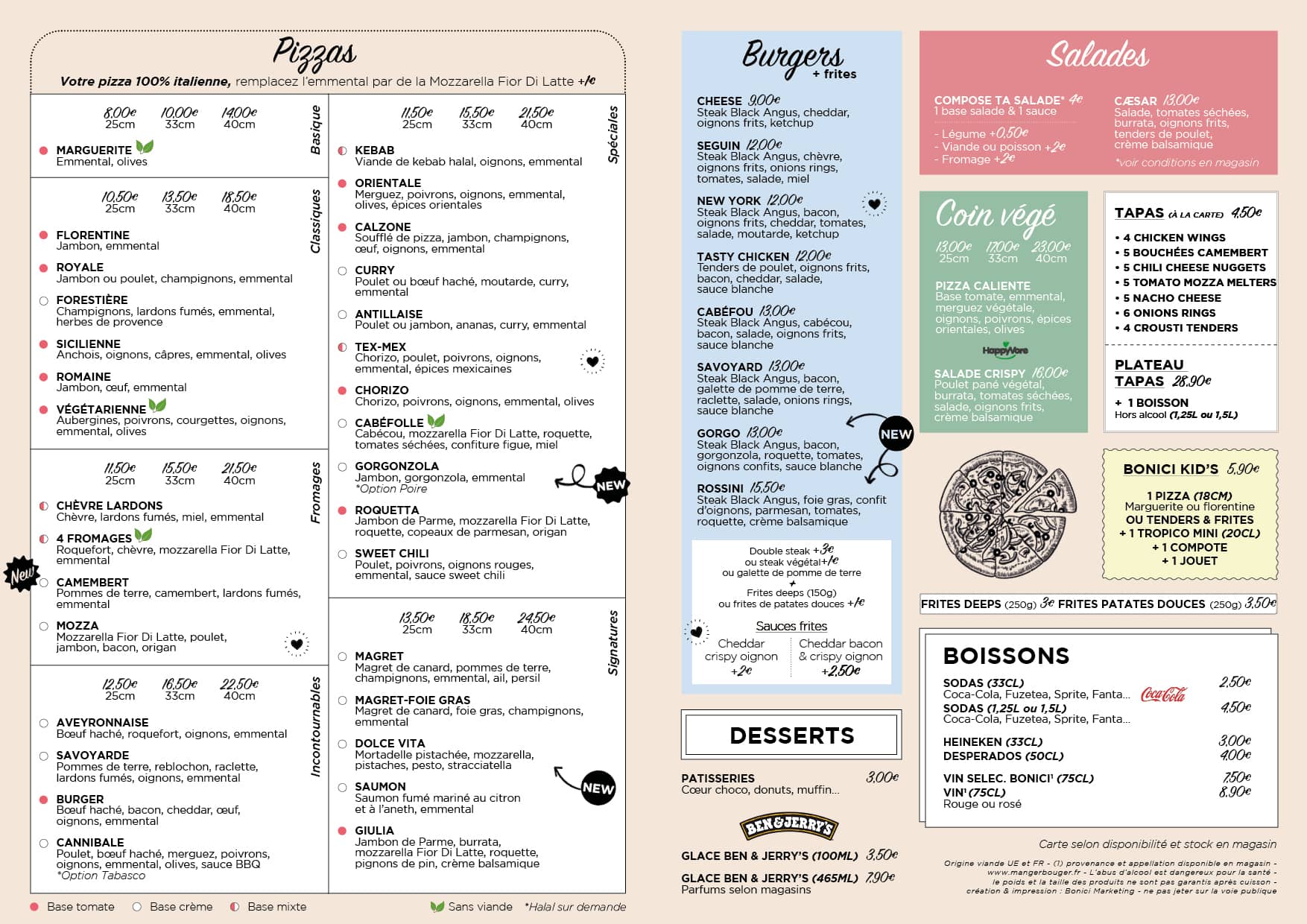 Du mardi au dimanche, Pizza Bonici vous propose ses pizzas à emporter ou en livraison de 11h à 14h et de 18h à 22h à l’exception du dimanche midi. Envie de vous faire plaisir et de mettre les pieds sous la table sans avoir à cuisiner ? Commander une pizza ou tout autre produit Pizza Bonici en ligne livré à domicile semble être la meilleure des options.