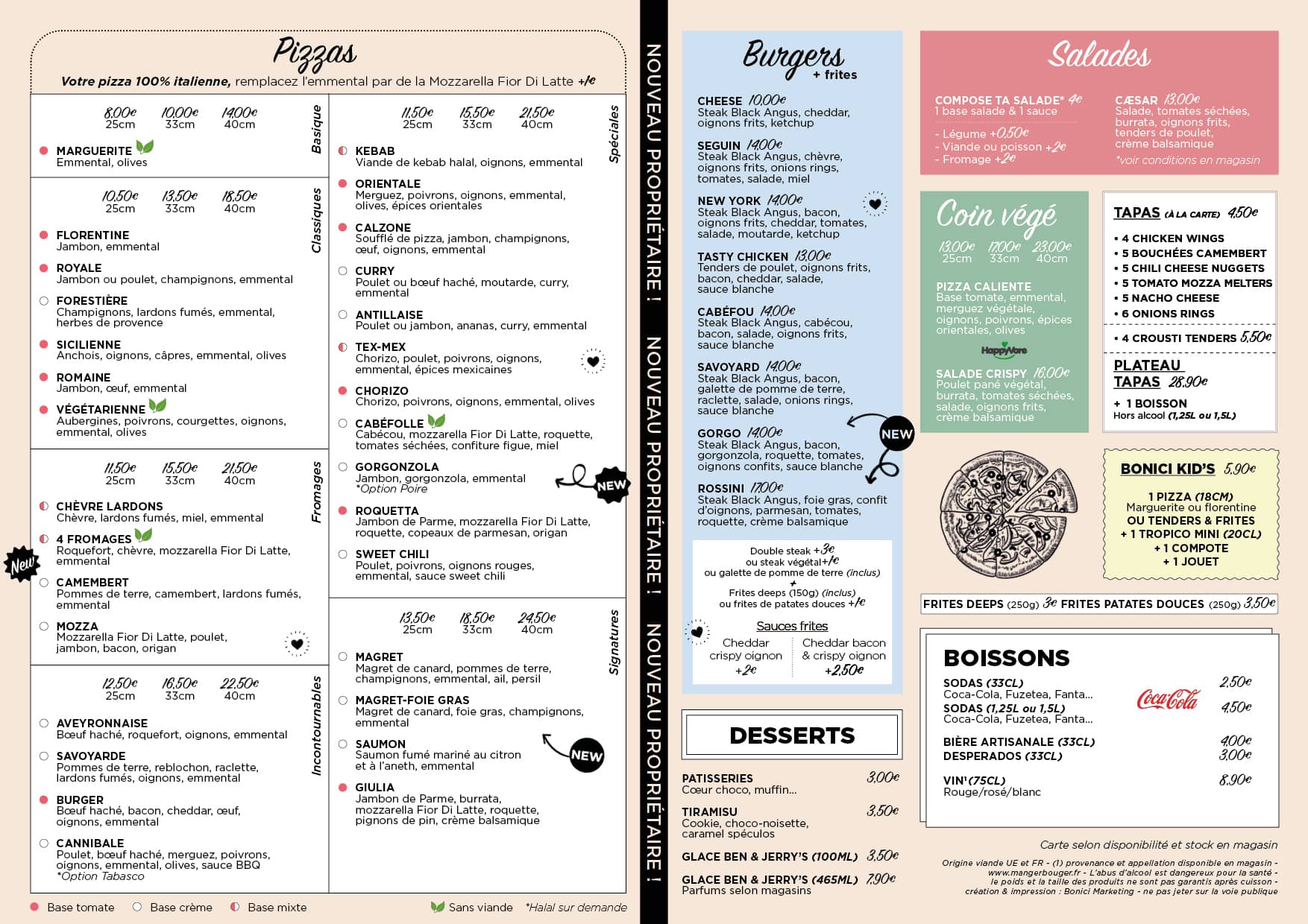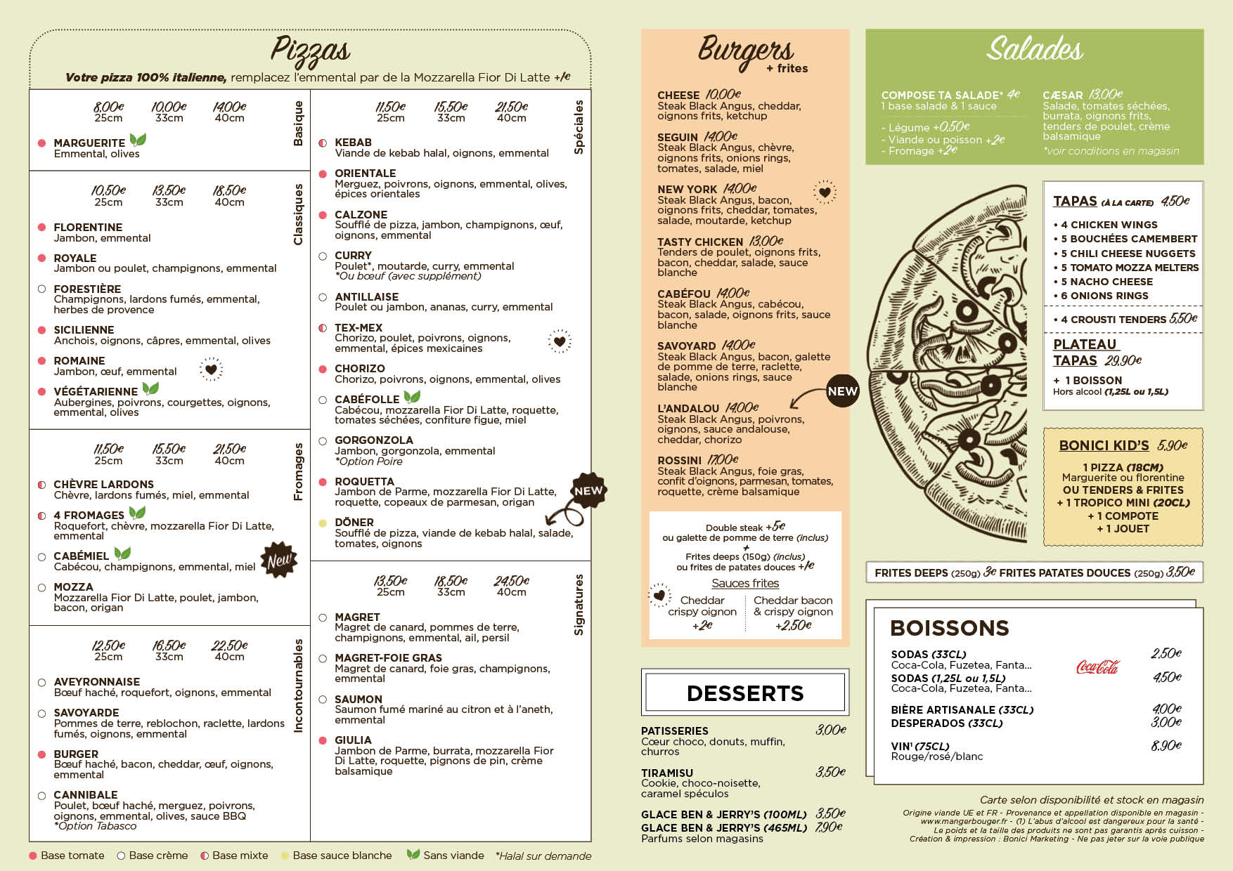 Vous pouvez choisir la base de votre pizza, quelle que soit sa recette : base tomate, crème ou mixte ! Nous proposons également de la viande et du poulet halal sur demande.