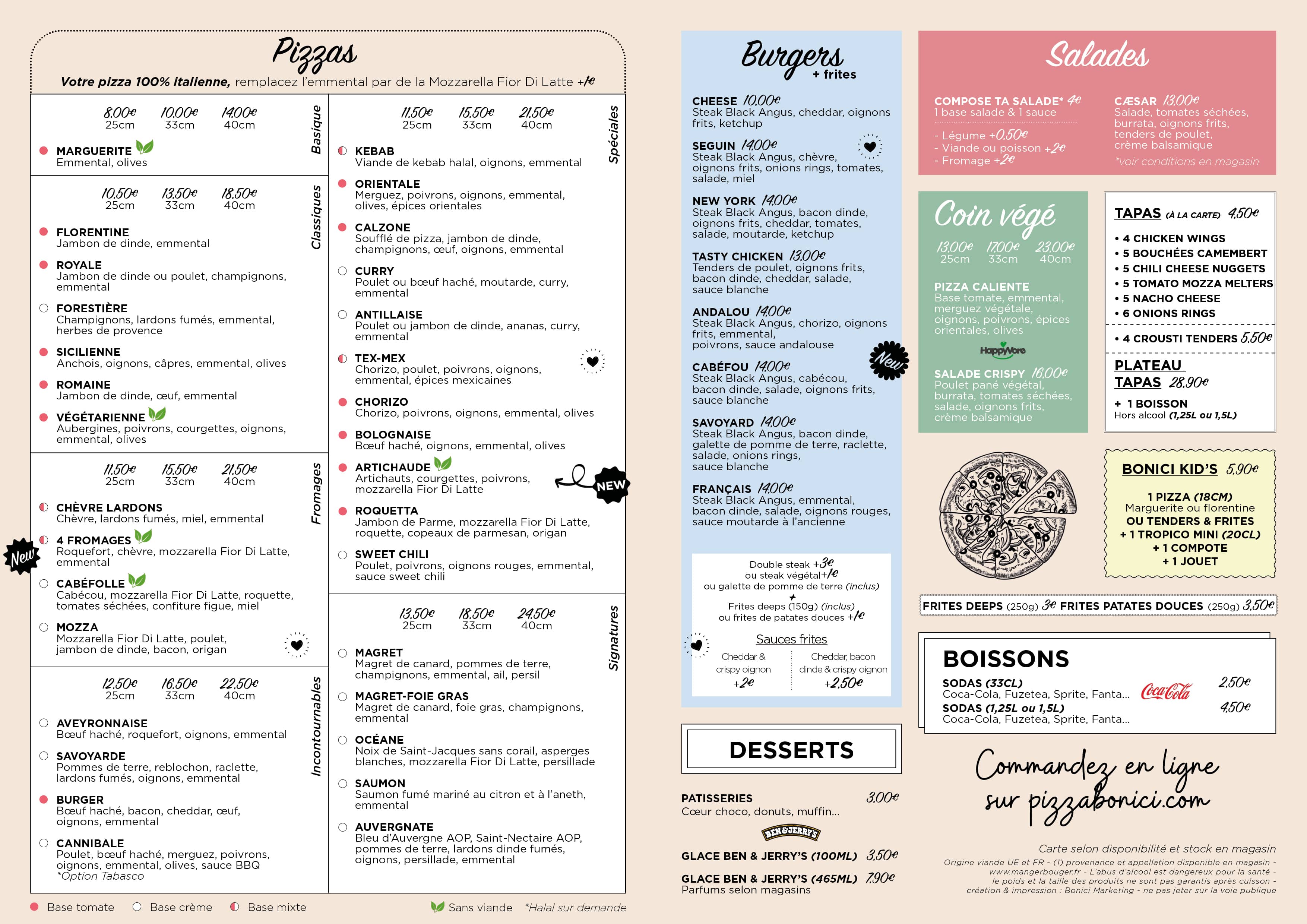 Chez Pizza Bonici, vous êtes assuré de trouver une pizza qui correspond à vos envies. Savourez une délicieuse pizza aux anchois et aux câpres ou préférez une pizza à base de camembert, de lardons fumés et de pommes de terre.