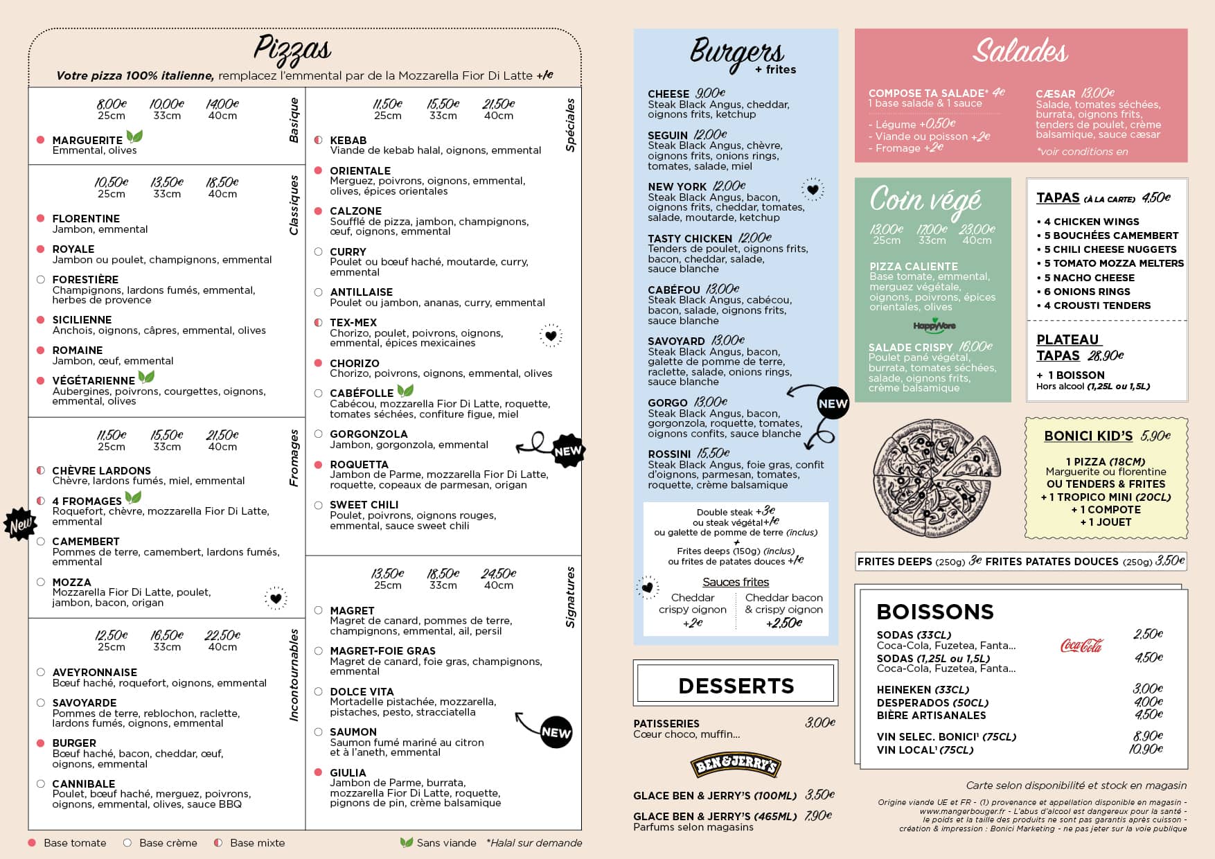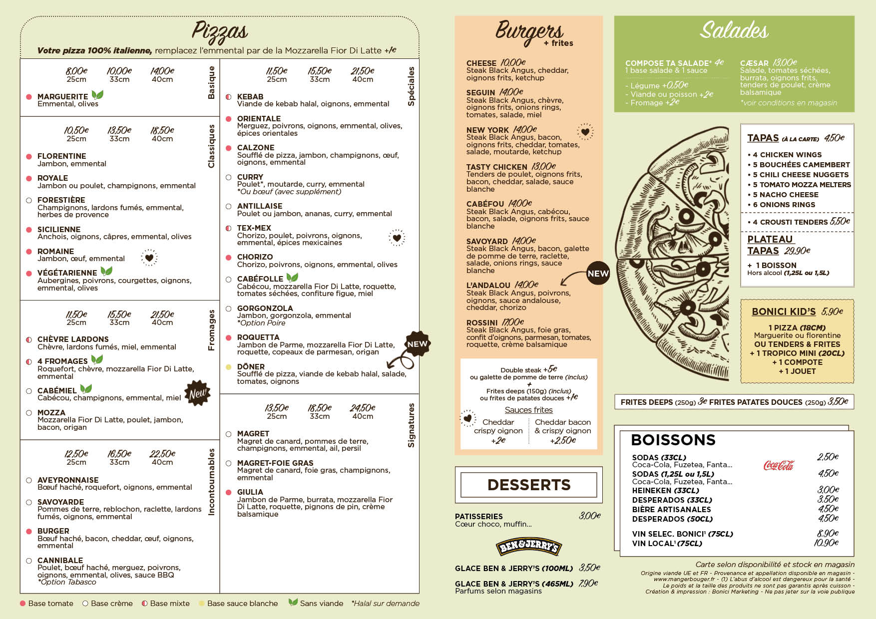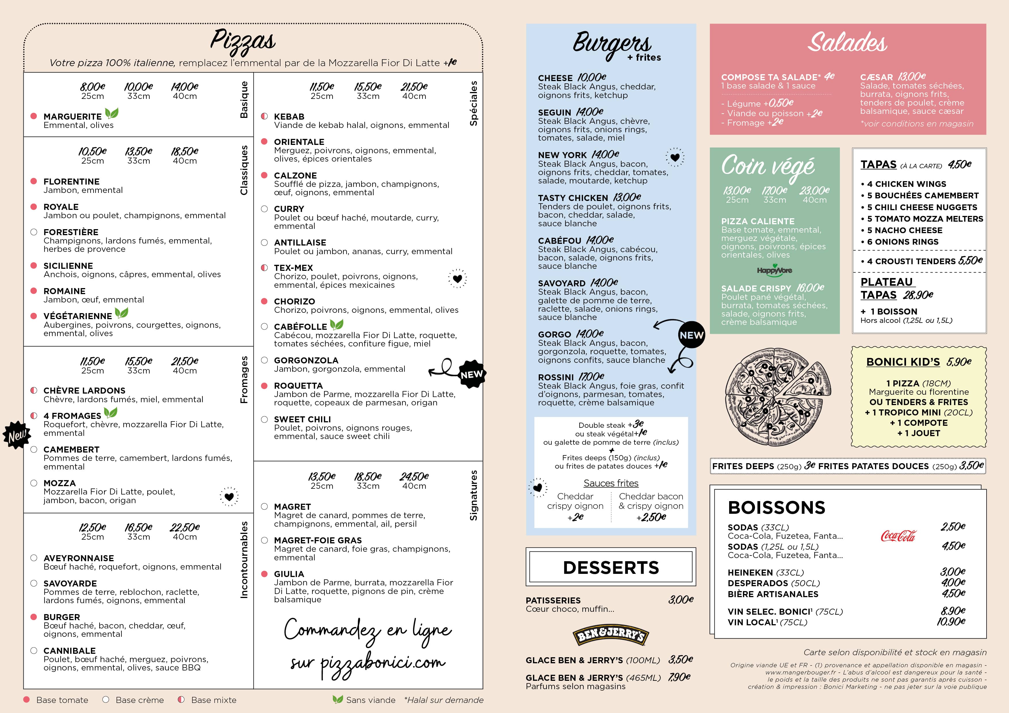 À emporter ou en livraison, choisissez et personnalisez vos burgers, pizzas, salades et tapas chez Pizza Bonici.